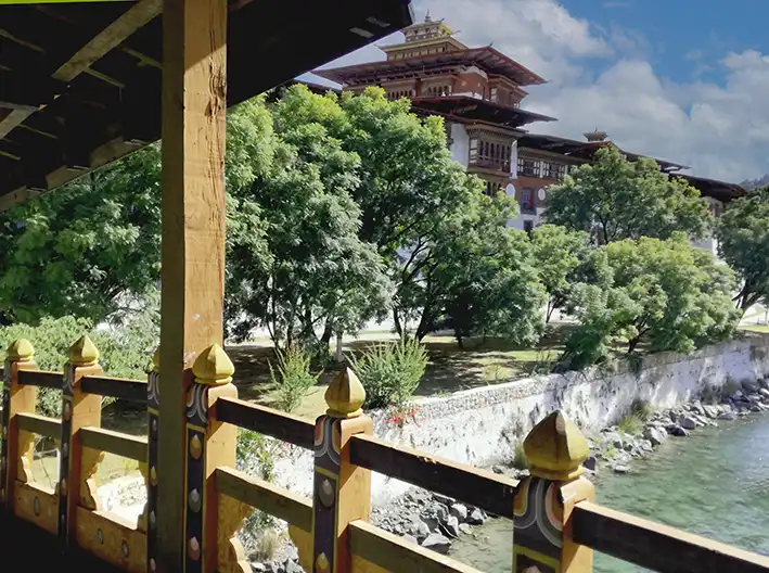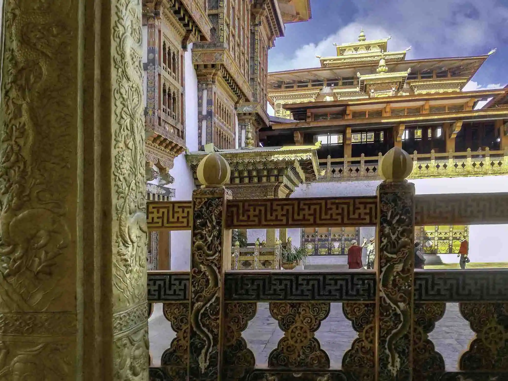 Sin embargo, este monasterio fortaleza se reveló como algo más que un simple ejercicio preparatorio. Llegamos de muy buena mañana y, aunque casi al final del recitado de mantras, nos acuclillamos al fondo de aquel salón rectangular no demasiado amplio, a tiempo para compartir después con novicios —éramos los únicos extraños aquel día— un pequeño almuerzo inesperado al aire libre en las mesas corridas que ocupaban el techado de uno de los laterales de la entrada del monasterio en obras y entre andamios y risas de aquellos futuros monjes budistas que tan felices parecían. Pasamos por el Tashichhon dzong,