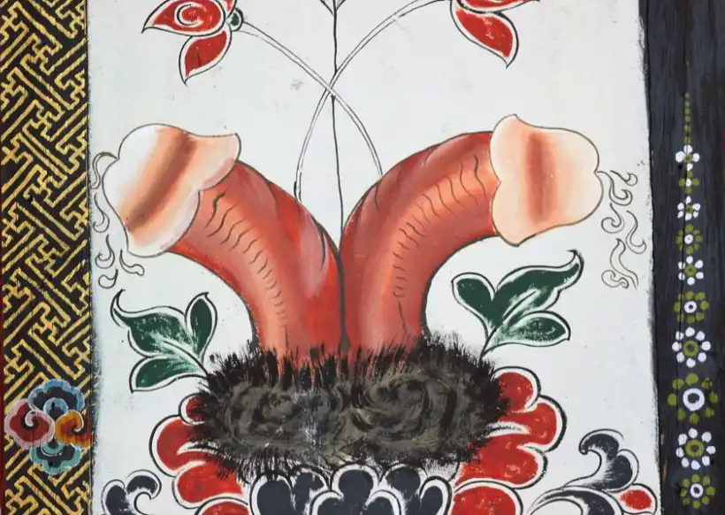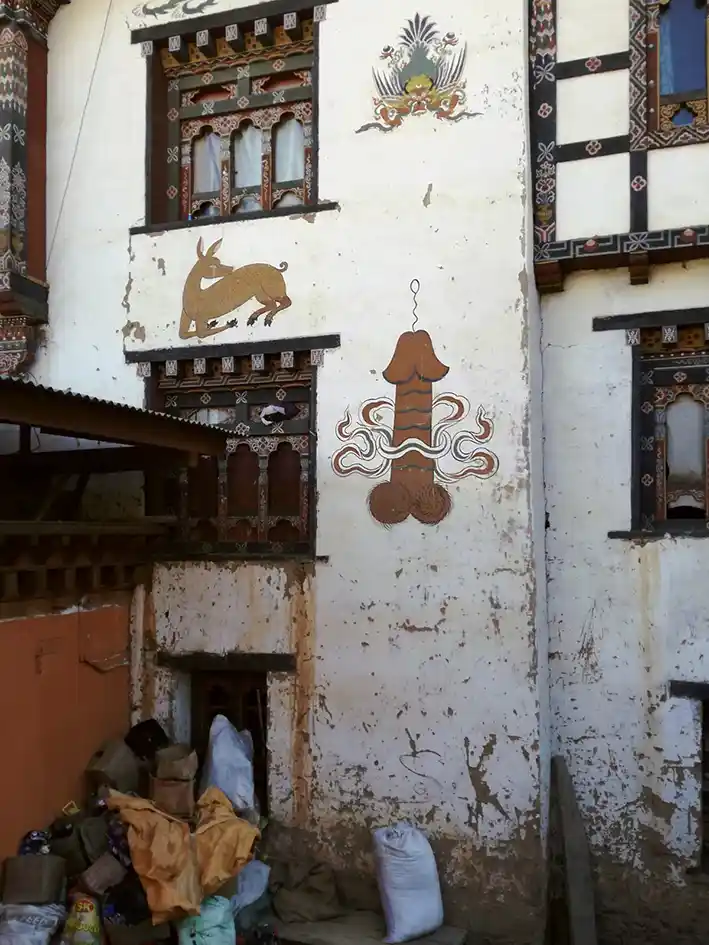 En Bután para los dibujos que cualquiera puede ver en el exterior de las fachadas de las casas de la zona de Punakha, también pero menos frecuentemente en los interiores, como las de las fotos que ilustran estas líneas, se prefiere el término ‘photshen’ (‘phot’ macho y ‘shen’ símbolo). Por más que la explicitud de los falos eyaculando escalen los encalados de los muros (la cervatilla reclinada hacia delante, como en la postura de yoga de igual nombre, que gira la cabeza entre las ventanas para mirar curiosa la escena), no hay procacidad. Algo así trasladado a Occidente se entendería sin discusión como un reclamo claro de lo que ofrece el interior, una valla publicitaria.